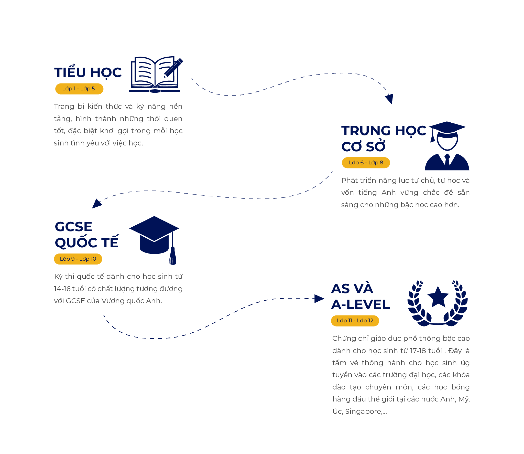 Kết thúc lớp 12, học sinh đạt được chuẩn năng lực ngoại ngữ C1 (tương đương IELTS 7.5+), hoàn thành chương trình THPT Việt Nam và thi lấy chứng chỉ A- Levels do OxfordAQA khảo thí độc lập và cấp bằng. A-levels là bằng tốt nghiệp tú tài, có giá trị tương đương với học sinh bản xứ thi tốt nghiệp A-levels ở Vương quốc Anh và được chấp nhận bởi các trường đại học trên toàn thế giới.