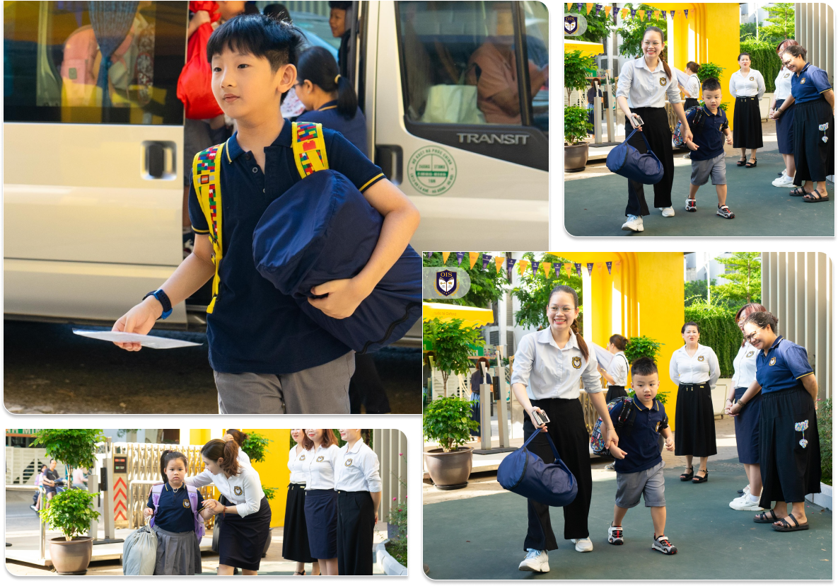 Khi ra vào cổng trường, 100% học sinh được điểm danh bằng thiết bị nhận diện khuôn mặt hiện đại. Sau khi nhận được đơn đăng ký tham gia dịch vụ đưa đón, bộ phận Dịch vụ học đường sẽ xác nhận trạm đón trả học sinh, thời gian, thông tin xe và nhân viên vận hành theo quy định OIS hiện hành