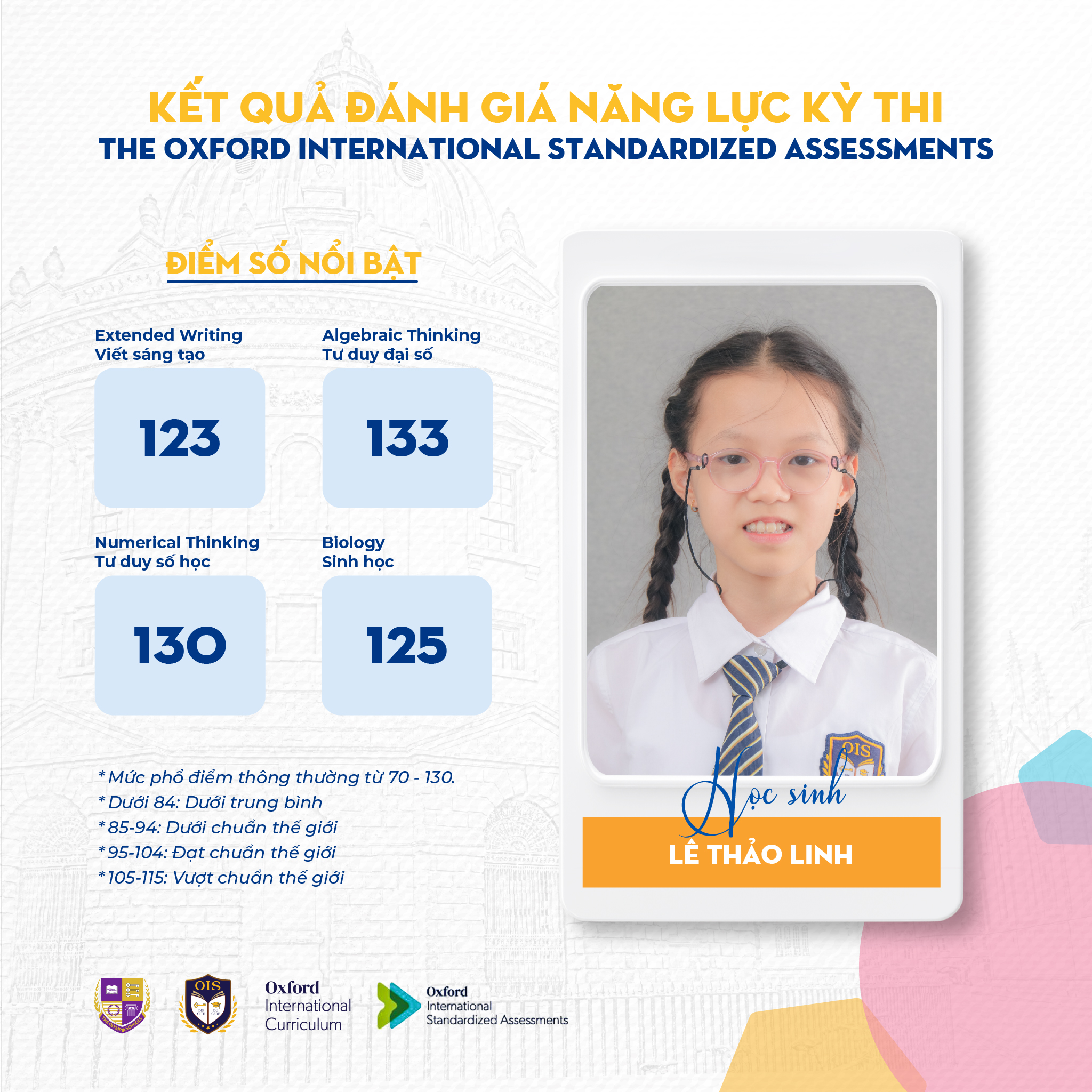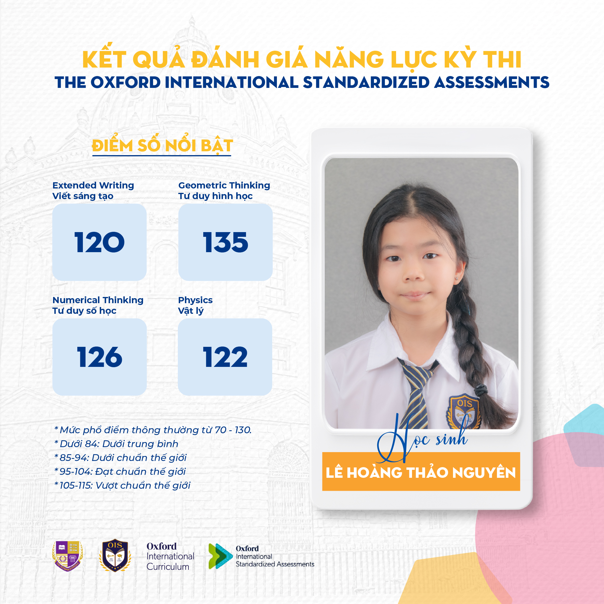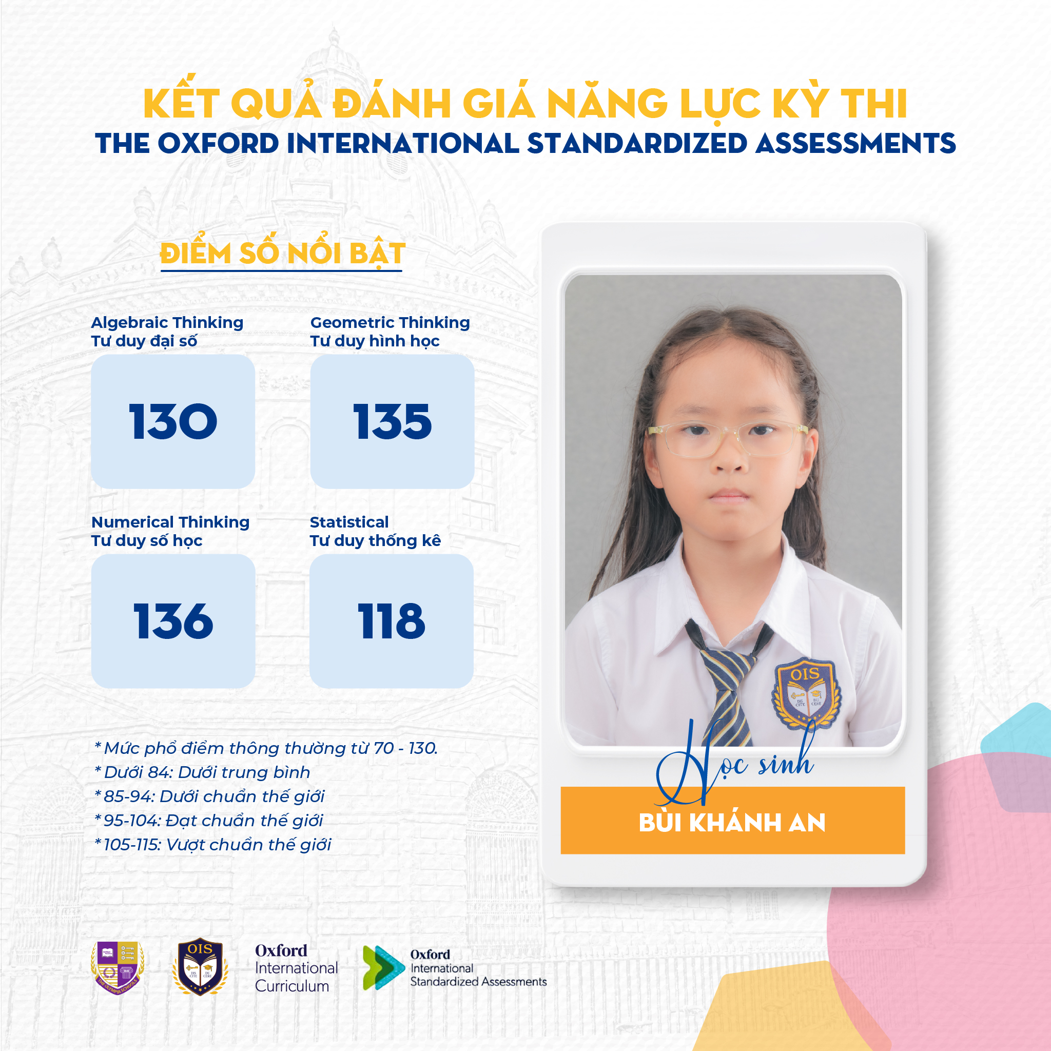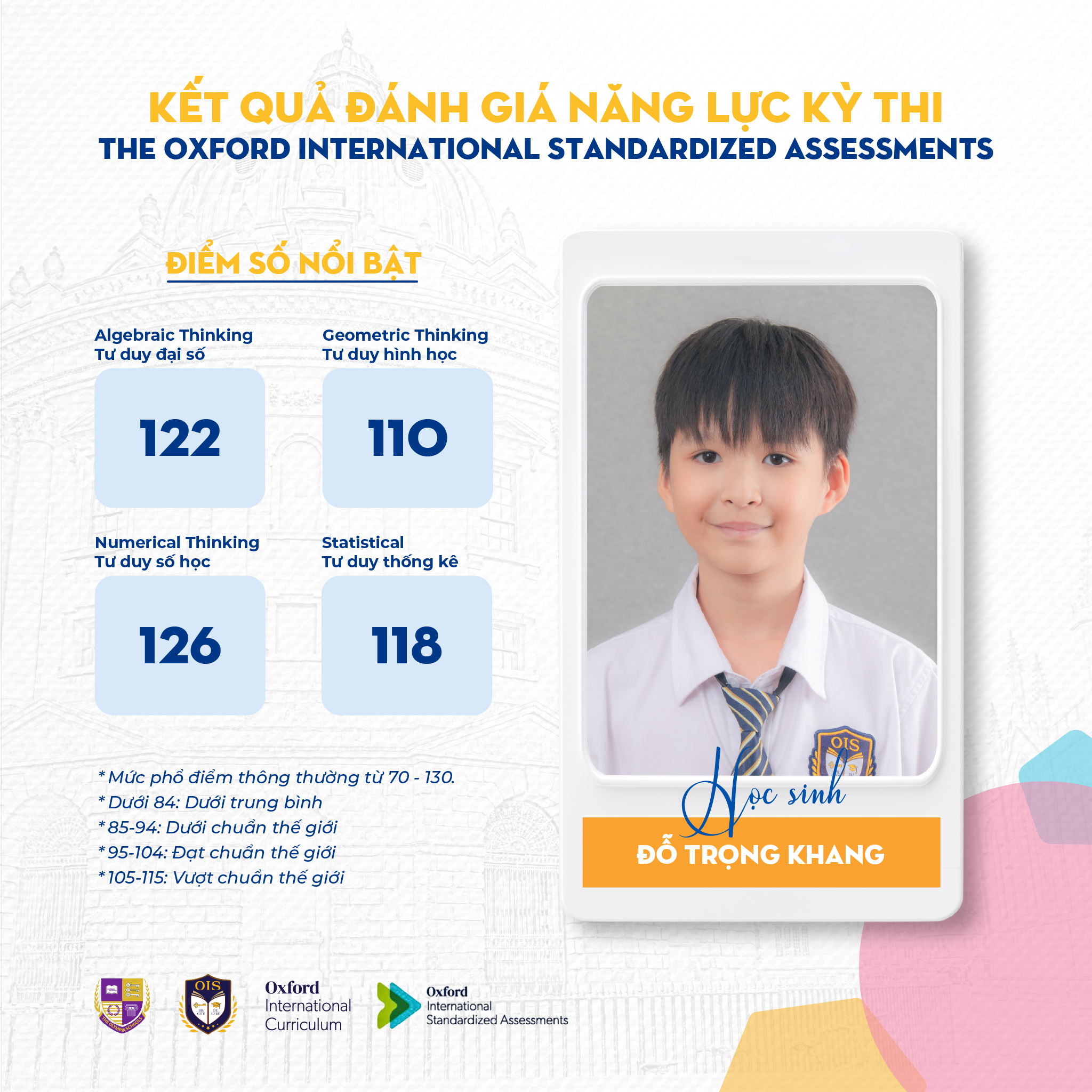 Trong năm học 2024-2025, học sinh Khối 5 THE OIS đã ghi dấu ấn rực rỡ tại kỳ thi Oxford International Standardized Assessments (OISA). Đây là kỳ thi chuẩn hóa quốc tế dành cho ba môn học cốt lõi: Tiếng Anh (ESL), Toán (Math) và Khoa học (Science), được thiết kế riêng cho Chương trình Quốc tế Oxford theo chuẩn Chương trình Quốc gia Anh.