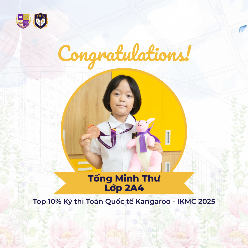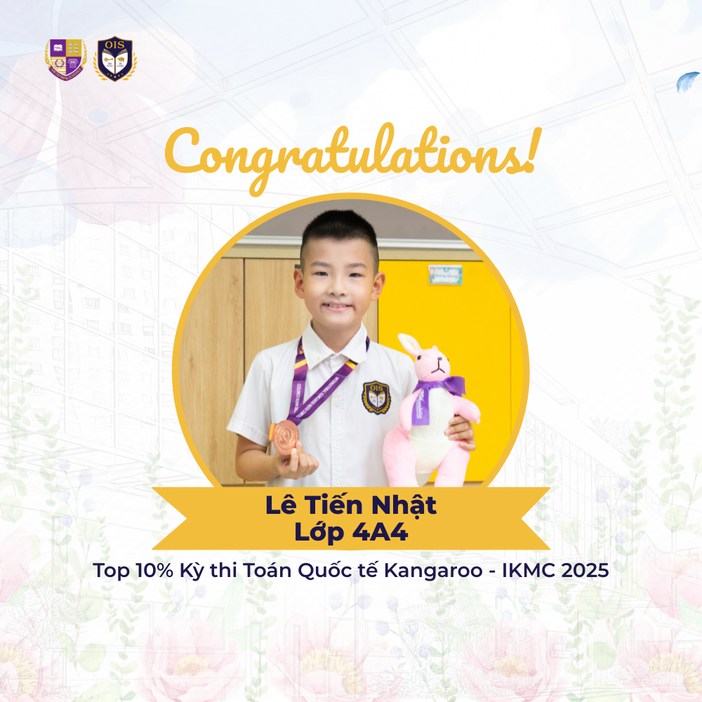 Tại Kỳ thi Toán Quốc tế Kangaroo – IKMC 2025, bạn Tống Minh Thư – Lớp 2A5 và bạn Lê Tiến Nhật – Lớp 4A4 đã vượt qua hơn 20.000 thí sinh đến từ 58 tỉnh/thành phố và nằm trong Top 10% thí sinh xuất sắc nhất.
